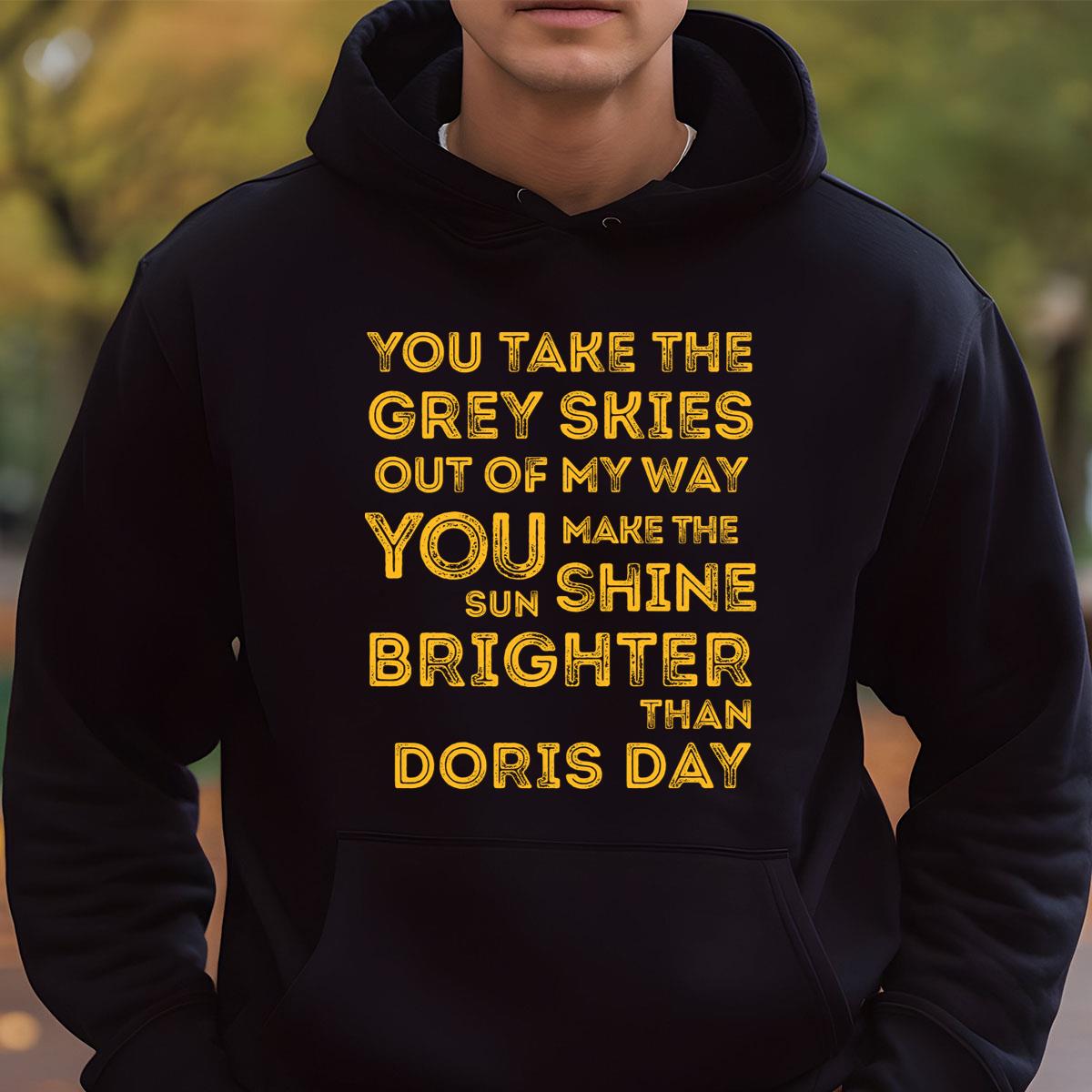 Check out our Doris Day Lyric Graphic T-Shirt – You Take The Grey Skies Out Of My Way Tee collection, available in diverse colors. With unique designs for major holidays and events, they’re perfect gifts for family, friends, and colleagues.